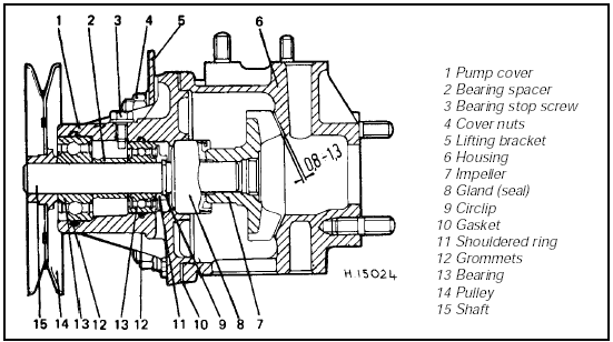 11 The pump shaft is an interference fit in the impeller, bearings, and pulley boss. How the pump is dismantled depends on whether only the gland needs renewing or the bearings as well, and what puller or press is available to get everything apart.